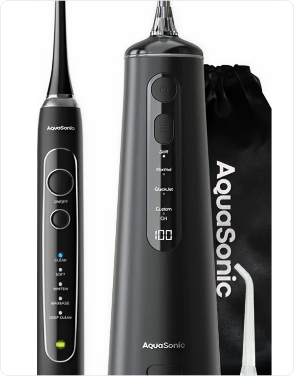 AquaSonic Elite Flosser (Black or White): This rechargeable water flosser offers effortless flossing with 4 modes, 8 pressure levels, and 4 tips for customized cleaning. The sleek design, 300ml tank, and travel-friendly build make it perfect for on-the-the-go oral care.